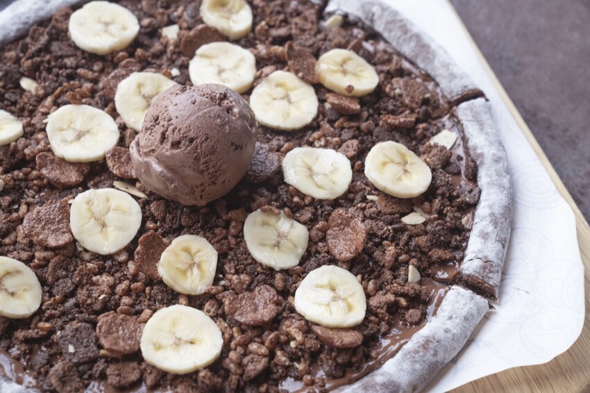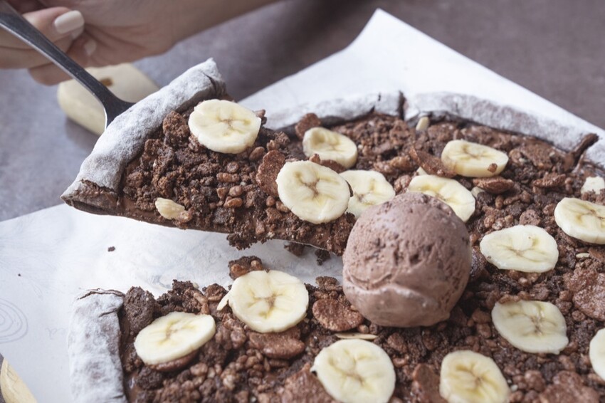 甜比薩的部分很推薦螞蟻人點拿娜黑眼脆脆,連餅皮都是由巧克力製作的,接著擺上巧克力脆、香蕉和榛果巧克力醬,最後還加入一球巧克力冰淇淋,這麼浮誇的組合一定要嚐鮮看看!