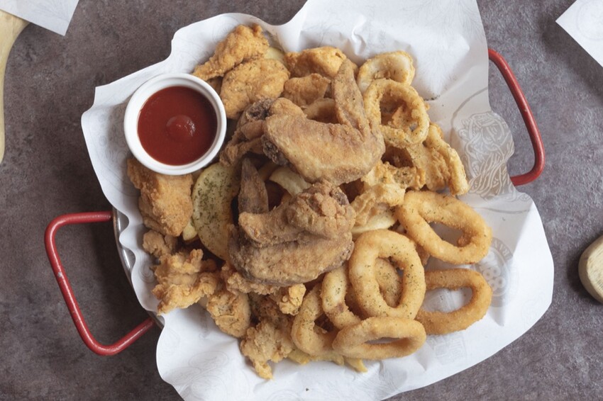 海陸我都要的炸物拼盤相當豐盛,看看這滿滿一大盤裡能吃到雞米花、墨魚、多利魚、雞翅、炸雞脆薯和洋蔥圈很適合多人一起分享~