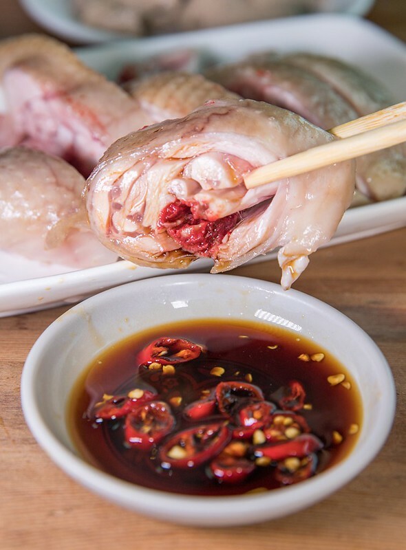 最後是主角白斬雞,老實說我對此物沒特別的興趣,但倒也不是不喜歡或討厭,應該說我為了那碗友人大吹特吹的雞湯切仔而來的原因大過這盤白斬雞,我的意思是我還沒吃前,但上桌後我一邊拍,竟一邊不爭氣的流著口水,這雞肉看起來也太太太嫩了吧,而且那粉紅肉色著實誘人。