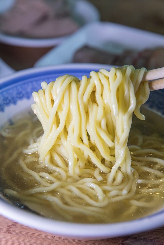 附上兩片肉因為是全瘦,雖然不至於柴口但沒什麼亮點,要不是泡在雞湯裡,可能沒滋沒味也不一定...,麵條就是切仔麵那種口感略空的黃油麵,吃起來算是涮嘴尤其是特別能吸湯。