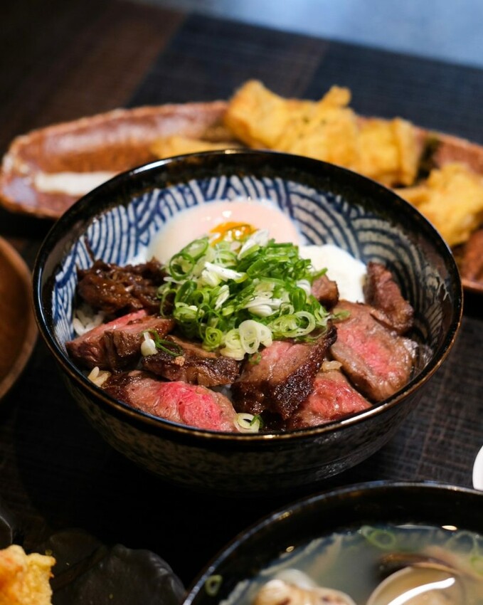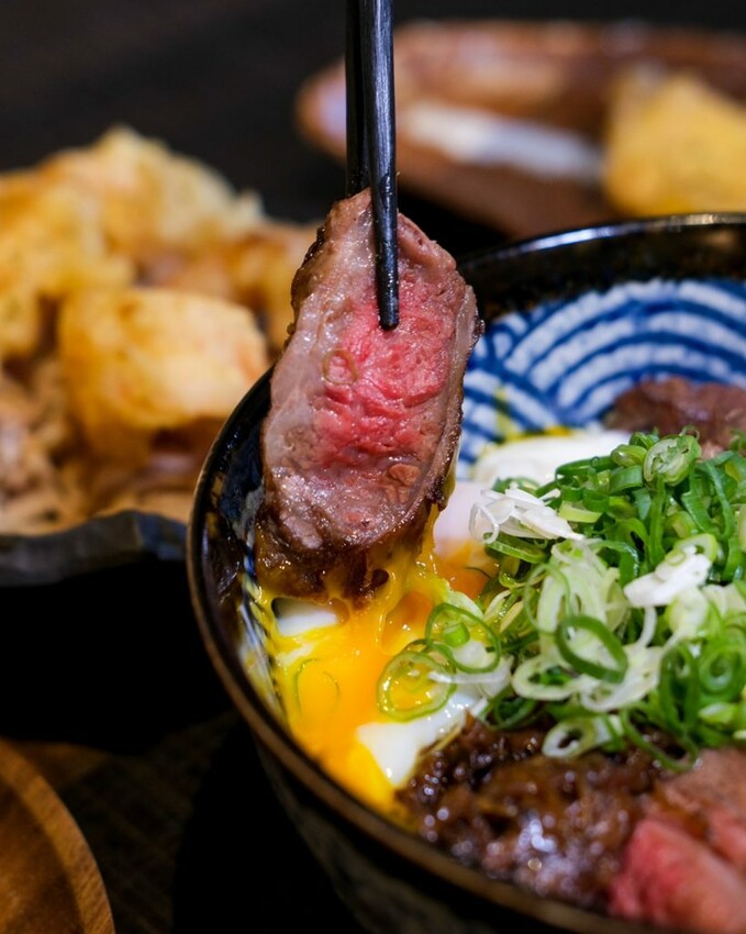 ▼將美國進口厚切和牛烤製八分熟,呈現鮮紅色澤的肉片蓋滿整碗飯,搭配半熟蛋、關山米飯及焦糖洋蔥蕈菇,澎派的視覺看起來超誘人。