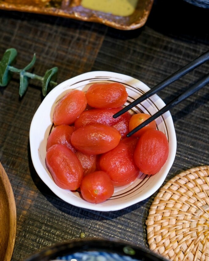 ▼店家手工去皮的醃漬小番茄,粒粒飽滿大顆且多汁,咬下去在爆漿的口感令人著迷。