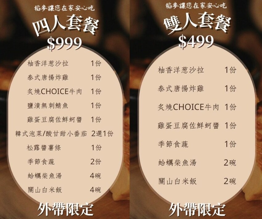 目前有推出兩人及四人的外帶套餐,疫情期間在家也能輕鬆享用到~