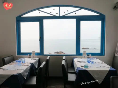 一整片藍白窗戶搭配無敵海景,感覺食物都變美味了,外木山情人湖濱海步道旁景第一排最美的海景餐廳-聖托里尼。