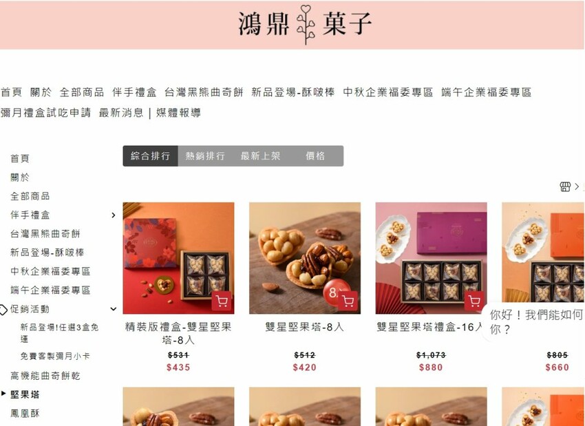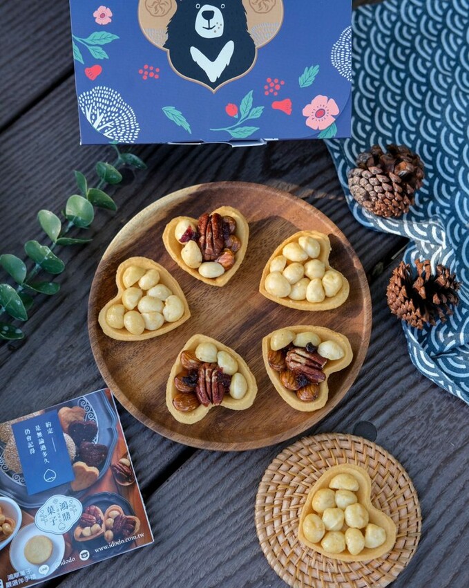 【鴻鼎菓子】販售品項以烘焙甜點為主,除了主打的招牌人氣心形堅果塔,還有台灣黑熊曲奇餅、酥啵棒、原味堅果、鳳凰酥等中西式點心,隨著節慶也會推出特殊限定造型禮盒,擁有超過20款的品項能夠挑選,官網預訂或直接到門市都能買到。