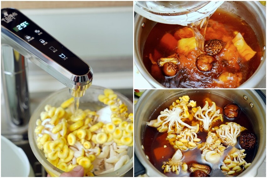 ▼後來又加碼放入前陣子去豐年農場買的菇菇太空包所種出來的珊瑚菇,先用RO水沖洗乾淨後,切塊就能丟下去一起烹煮啦!
