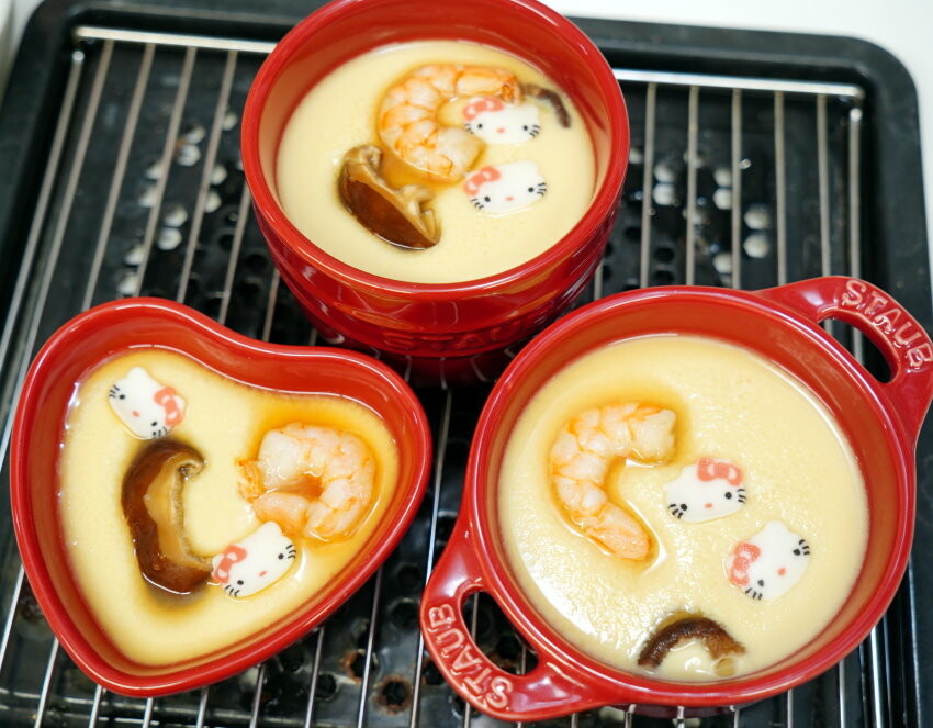 ▼茶碗蒸出爐前再放幾片日本HELLO KITTY造型魚板繼續悶一下,沒多久就可以拿出來享用啦!!整個就很卡哇依啊~~