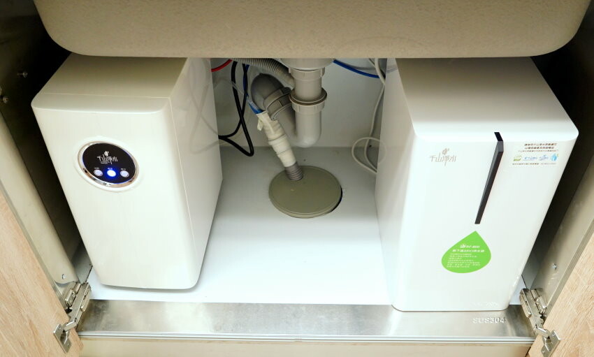 ▼「TK-5000 廚下型雙溫觸控飲水機」主機也是小小一台,搭配的淨水器是「RF-800 廚下直出RO淨水器」,他們家採用的是無桶直出RO設計,可以節省一半的廚下空間,而且一天還能製造400加侖的大流量,換算起來大概是1514公升,對一般小家庭來說也很夠用!