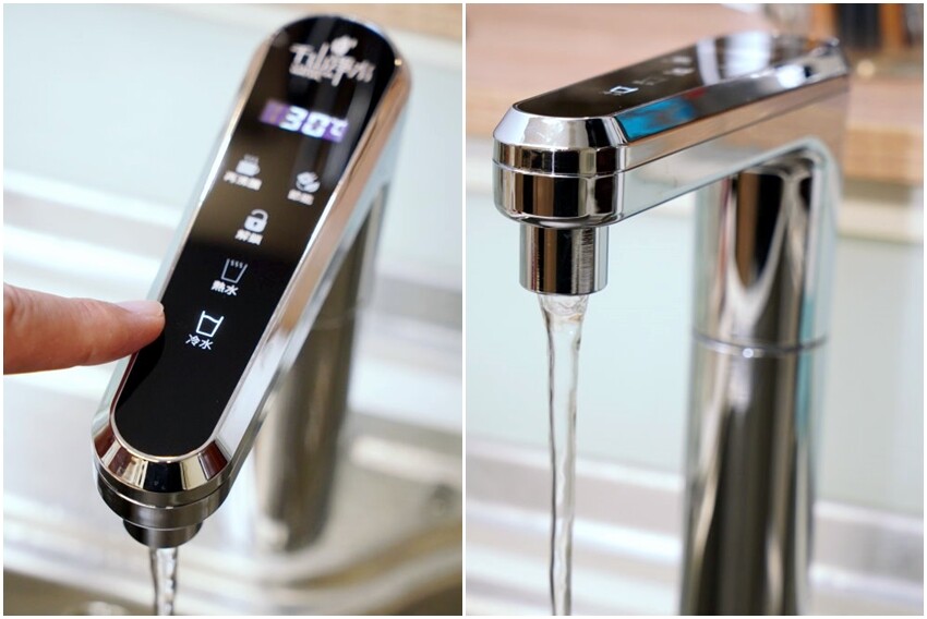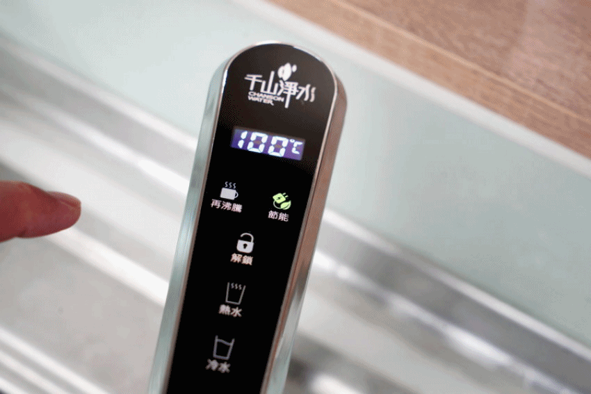 ▼電子觸控水龍頭外型簡約,搭配高質感設計,輕輕一碰就能輕鬆出水;面板上會清楚顯示溫度,而且按鍵不複雜,只有冷水、熱水、解鎖、節能、再沸騰等功能,相當直覺的操作更是讓人一目了然!