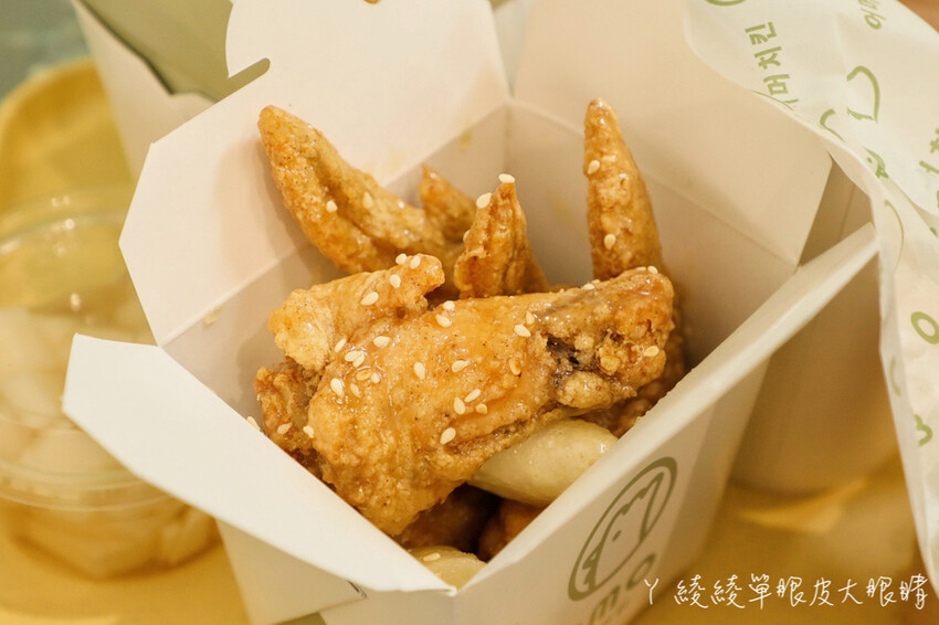 嗜辣成癮的朋友絕對要點經典辣味洋釀炸雞來吃,紅通通的韓式辣味醬搭配酥脆的炸雞,超級夠味!推薦無辣不歡的朋友來挑戰!越吃越過癮啊!小份餐點內容大約是雞腿和雞翅各三塊,加價$20元可加購炸年糕!年糕Q彈帶勁,相當美味!