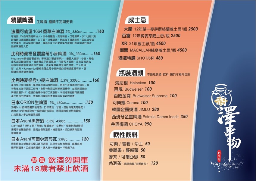 現場提供精釀啤酒、威士忌、啤酒、韓國燒酒等等,注意喝酒不開車,未滿十八歲請勿喝酒喔!