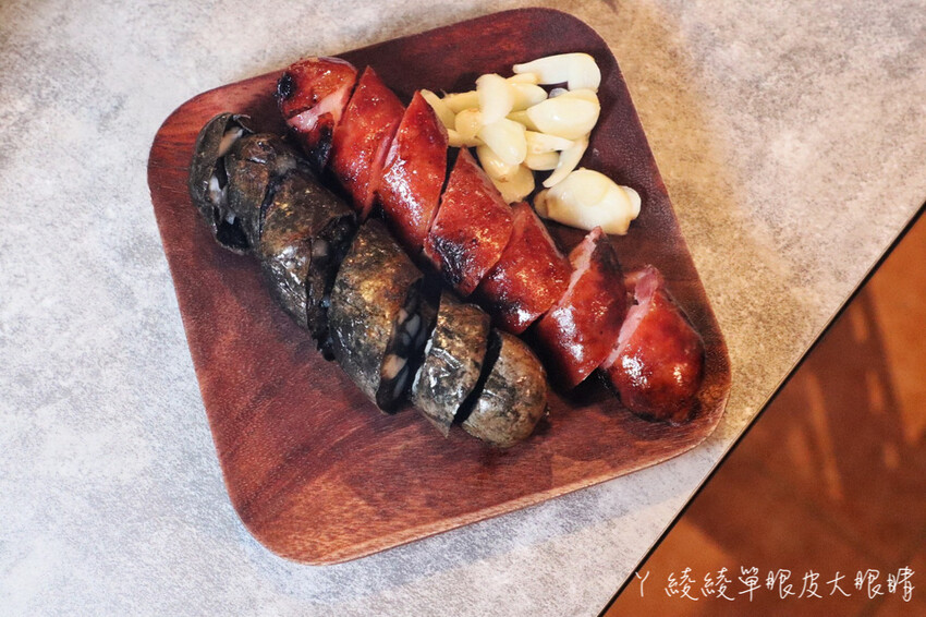 香噴噴的碳烤高粱香腸跟墨魚香腸拿來配酒最讚啦!旁邊還有蒜片呢!(喝酒不開車,未滿十八歲請勿喝酒)