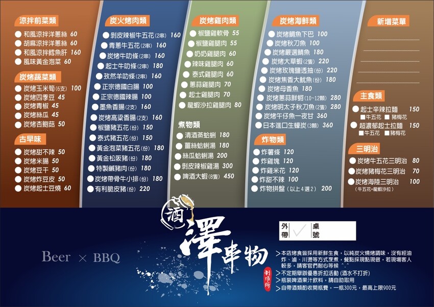 酒澤串物制作所的菜單有涼拌前菜、炸物、炭火烤肉、海鮮、雞肉、蔬菜、湯、三明治跟酒等等,餐點價位中等。(未滿十八歲請勿喝酒,喝酒不開車)