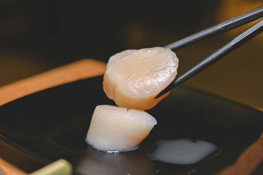 10元硬幣大小生食級干貝,肉質細緻飽滿鮮甜。