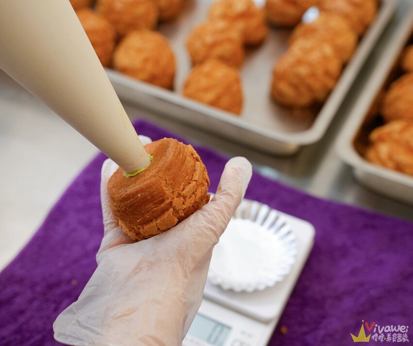 ▲泡芙一顆顆排排站好!有著菠蘿外皮的泡芙是我的最愛!店家會在客人點餐後才擠進內餡~讓泡芙的口感可以維持在最佳狀態!