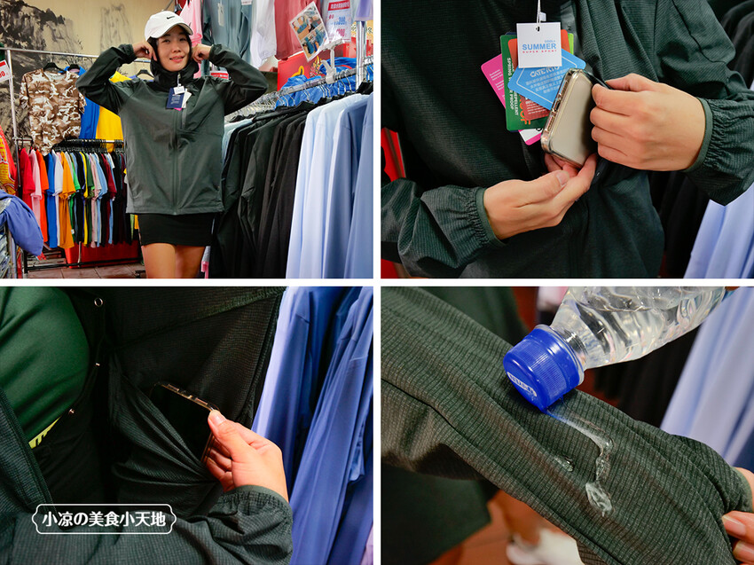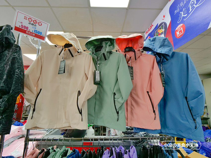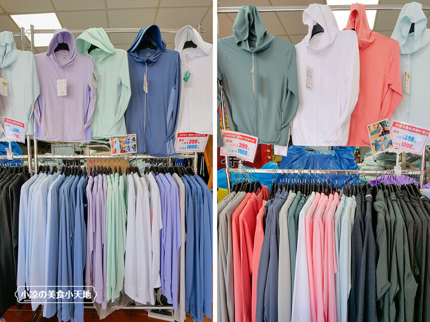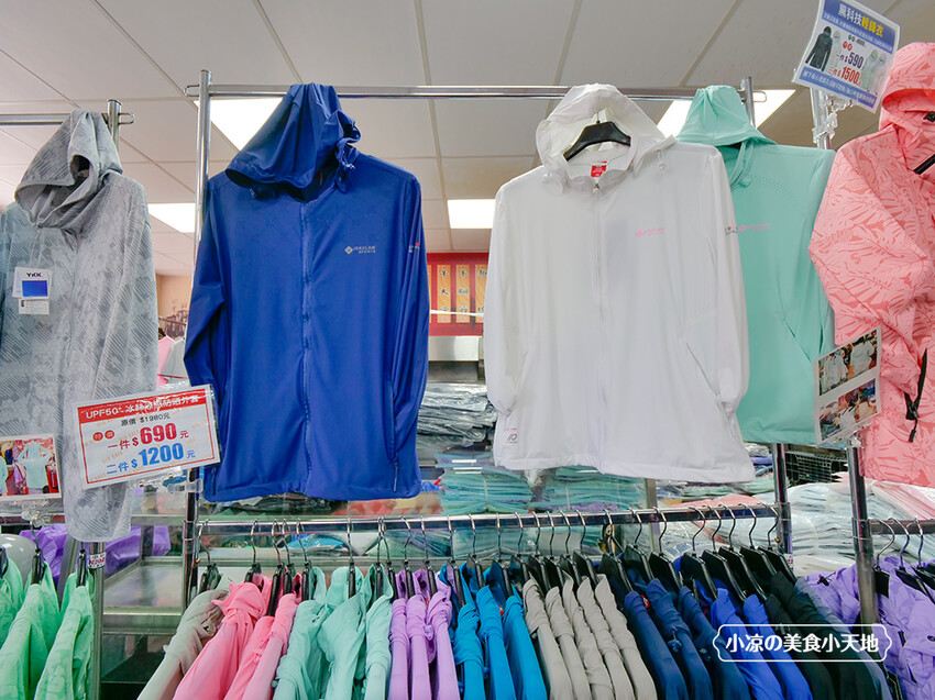 ▲門口旁的超強防曬外套也好亮眼!不但能防曬,亮麗且透光的材質與色系穿在身上真是好看!而且相當顯眼,也是有點半透明效果。重點來了,一件只賣$100元,這也太便宜了吧!