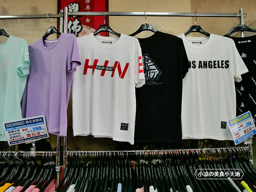 ▲這區是冰塊牛奶絲男女涼感衣,最大特性是涼感面料,瞬間可以降溫5度,穿起來吸溼排汗且透氣不悶熱,而且材質的超高彈力,穿起來更加舒適,又親膚,當天試穿的感覺就覺得很不錯,一件也只賣$299元,買五送一,款式色系都蠻好看,有頗多選擇,快來買爆他就對了!