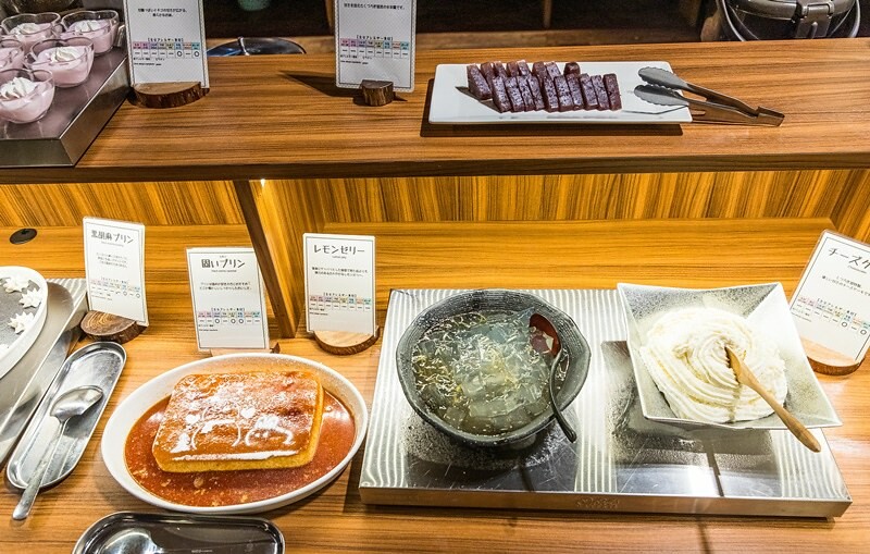甜點以日式為主,葛粉、布丁、果凍和抹茶わらび餅和簡單幾樣略帶洋風得甜點如起司奶油蛋糕等。