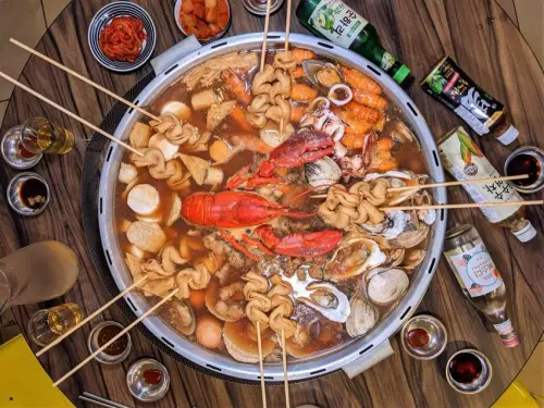 除了招牌的一隻雞外,這裡的海鮮也是十分瘋狂,像這樣巨大的木桶裡面裝著滿滿的海鮮,光看就讓人非常震撼。