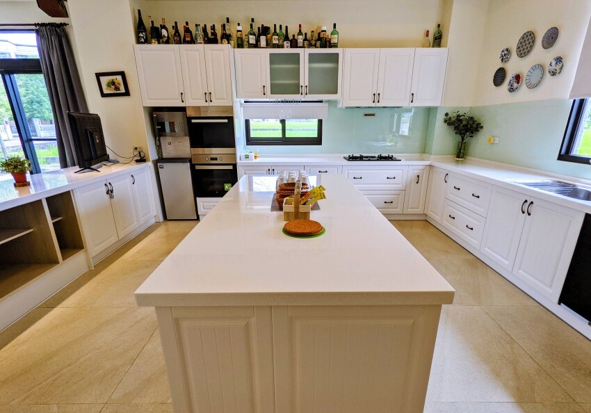 ▼若包棟都能使用廚房設備,廚房的空間能容納多人同時作業,把中島檯面當成工作區、聊天聚餐區,享受不同於自家的休閒體驗,畢竟對於一般居住空間有限的小家庭,擁有中島到整個漂亮系統廚房是個奢求。