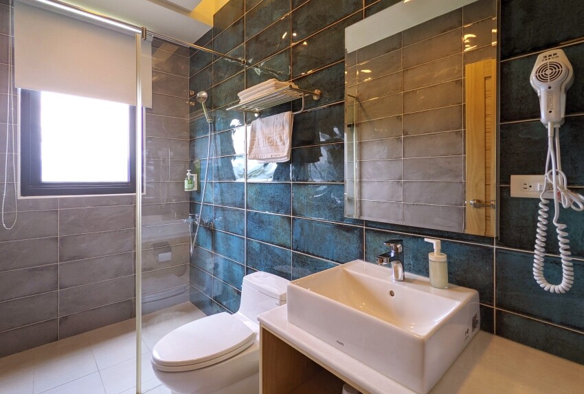 ▼迷迭香 4 人房衛浴磁磚較為不同,為藍綠色混搭的磁磚,在不同光源折射之下都能顯現其質感。
