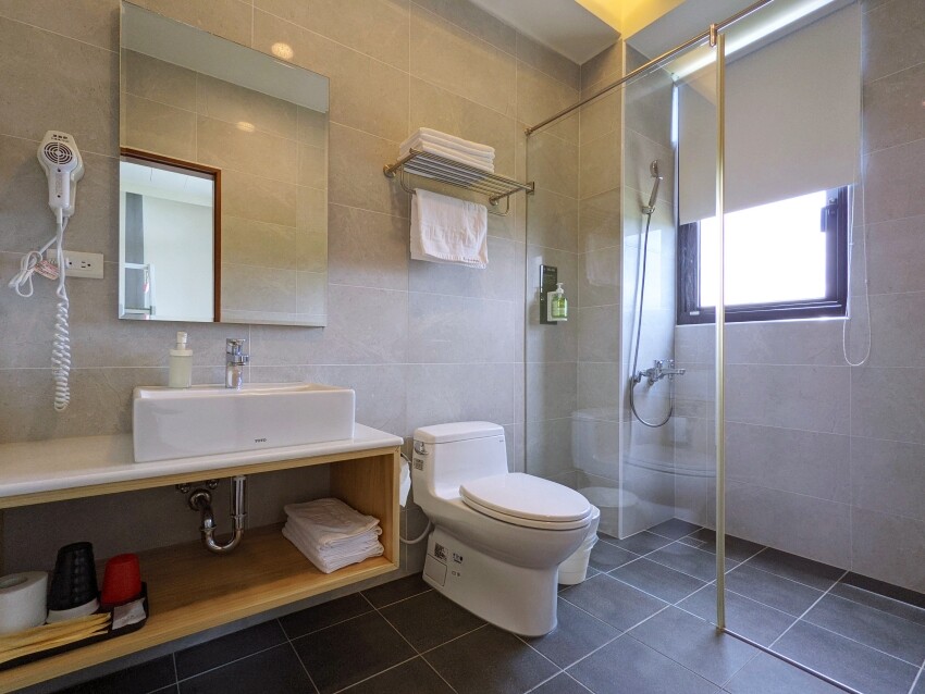▼衛浴用淺色牆面、地板看來簡單又大器,在日光映入室內時,色調非常柔和,而設備均採用 TOTO 乾濕分離衛浴設備。由於環保因素,民宿不主動提供大浴巾,每人提供 2條 48 兩厚小毛巾,如有需要可向民宿提出。