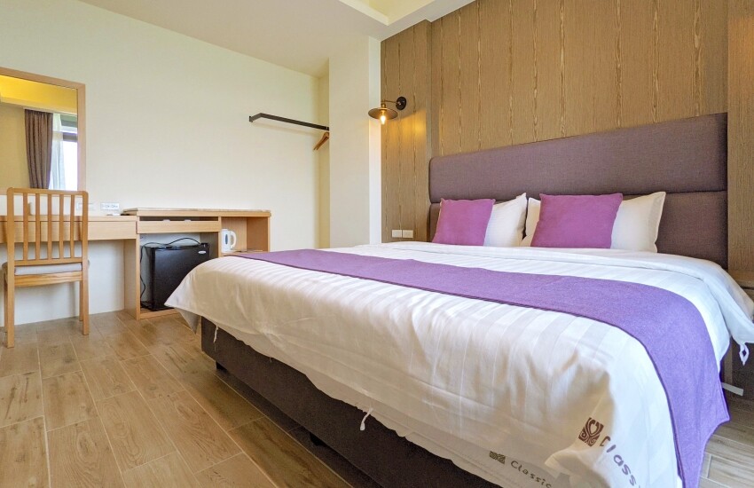 ▼203薰衣草2人房為 9 坪,床尾巾、枕頭、床頭板、窗簾都是浪漫的紫色系,加上床頭燈的造型與光源點綴之下,夜間特別有氣氛。