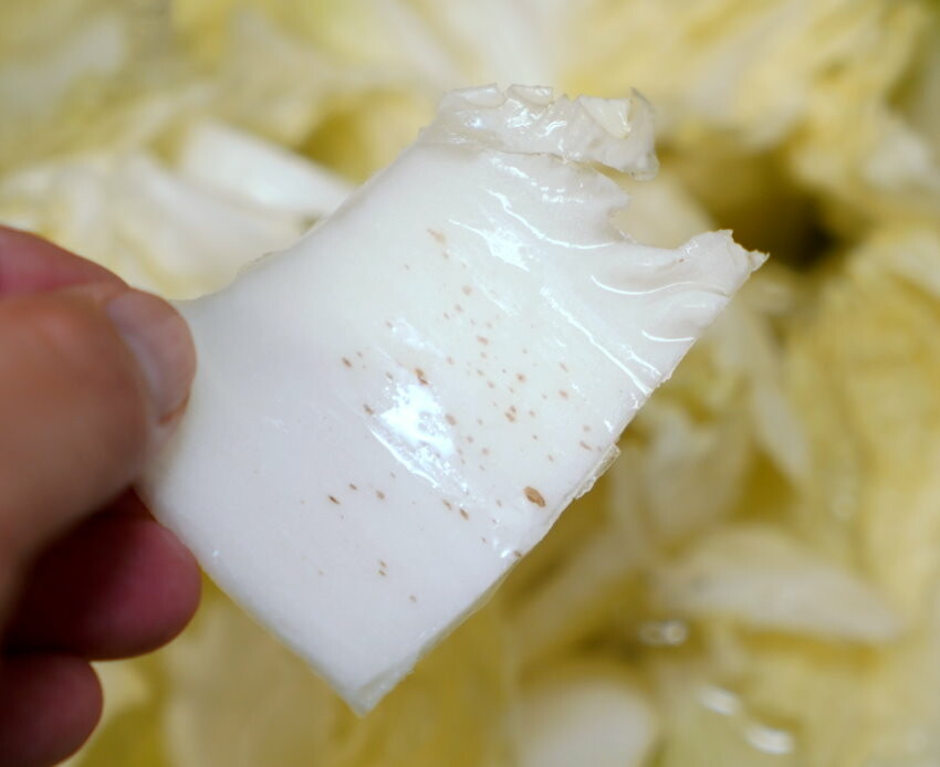 ▼半小時後可以見到高麗菜脫水,變得軟脆,此時再用飲用水將外表多餘的鹽巴沖掉即可。