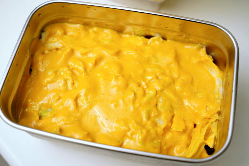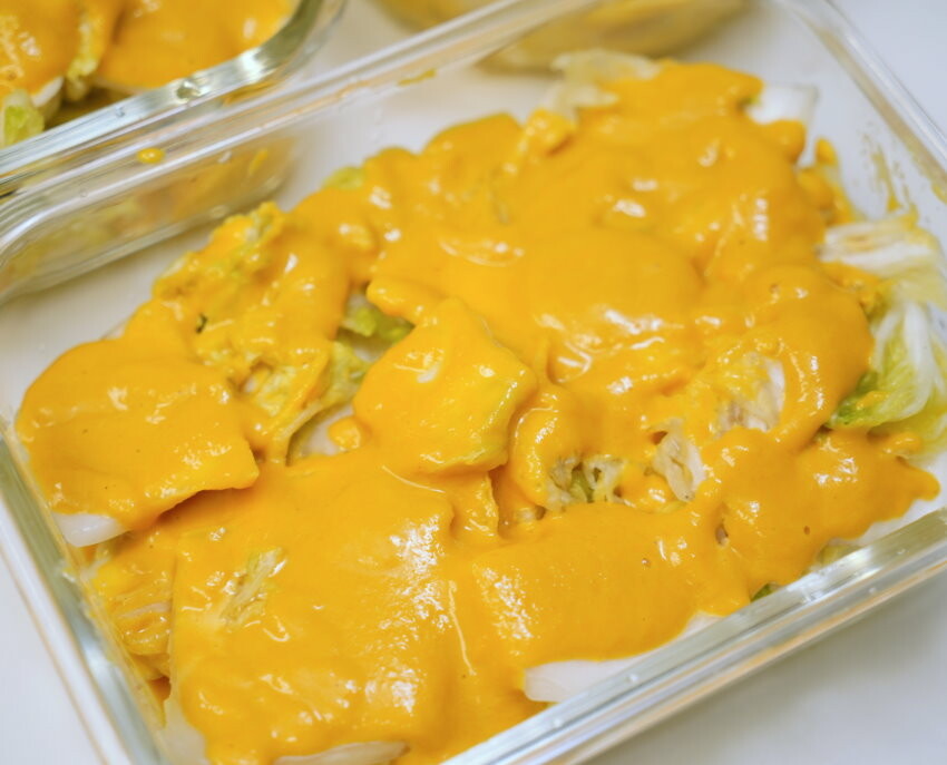 ▼一層蔬菜、一層醬汁堆疊進保鮮盒中。