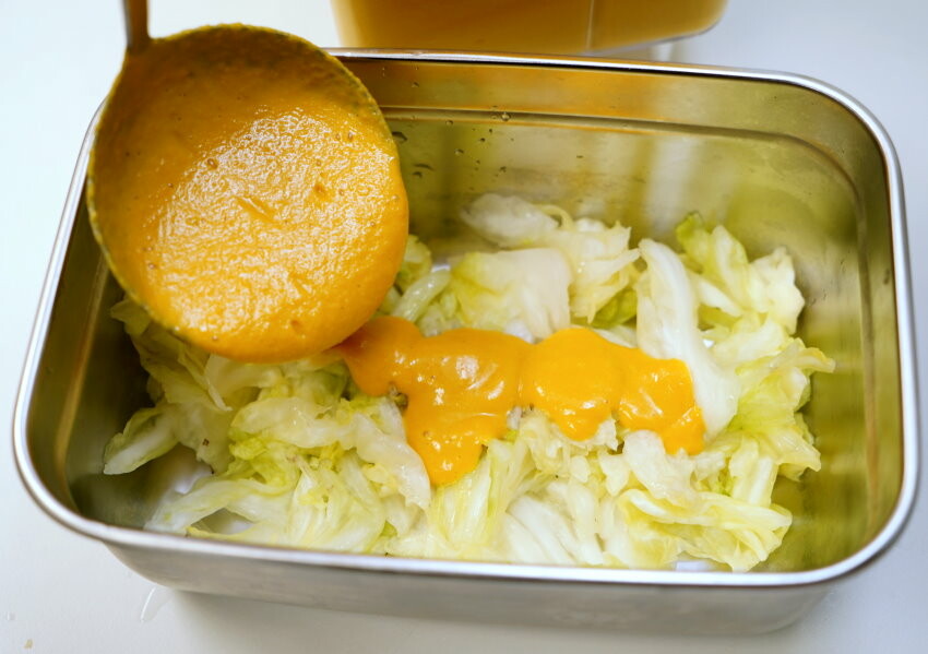3.將蔬菜用手擠掉多餘水份,先放一層到保鮮盒中,再淋上一層醬汁,如此交叉推疊至八分滿即可蓋上蓋子放入冰箱至少6小時。