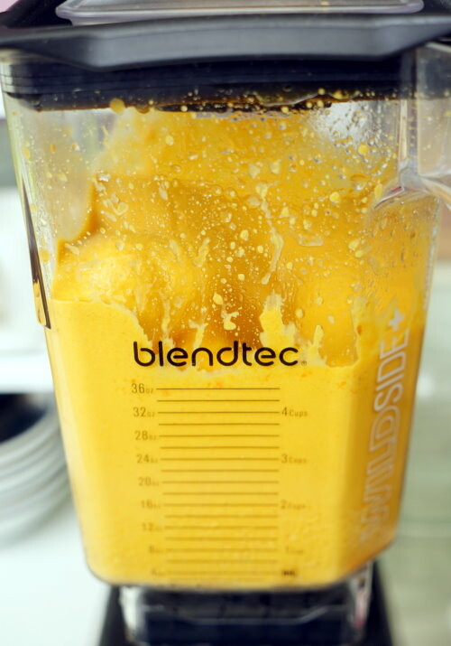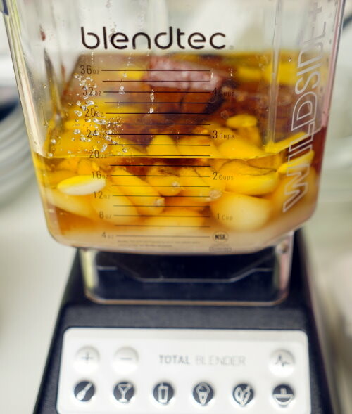 2.等待蔬菜去青的時間,可以先來製作醬汁,首先將紅蘿蔔去皮切塊後,和蒜頭、豆腐乳(想吃辣味就用辣豆腐乳)、蘋果醋、砂糖、橄欖油一起放入果汁機打成醬汁備用(此時可以先品嚐醬汁的口味來增減砂糖、蒜頭、蘋果醋等調味料)。
