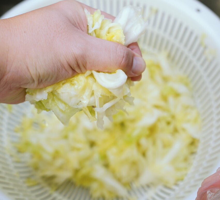 1.將大白菜、高麗菜切成自己喜歡的大小,洗淨後,各加入2~3大匙的鹽巴後,用手攪拌、搓揉,可放在洗菜籃或大塑膠袋中靜置半小時(此目的是為了破壞蔬菜表皮細胞、讓酵素失去活性,能夠去除苦澀味) ,半小時後,蔬菜出水,再用食用水把蔬菜表面洗淨、瀝乾備用。)