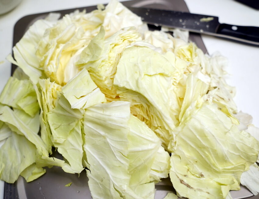 ▼首先將高麗菜切分自己喜歡的大小,葉片可以不用切太小片,有梗的地方再切小一點即可。