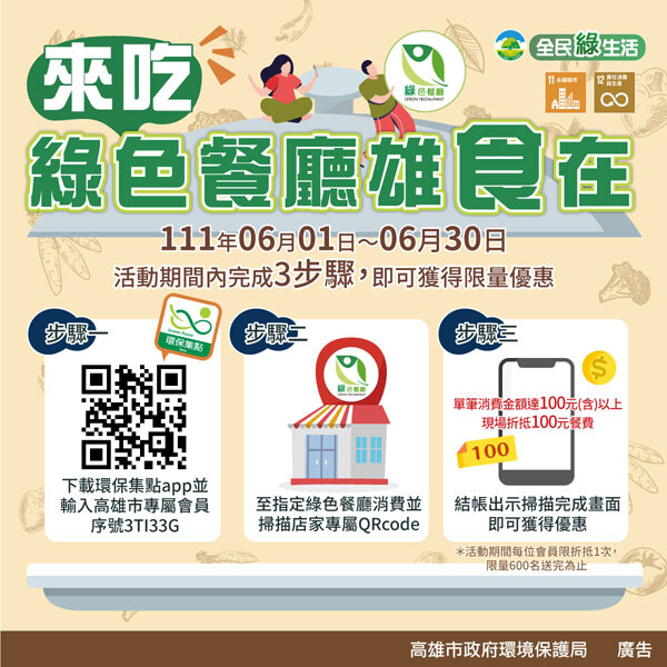 來吃綠色餐廳雄食在:至合作綠色餐廳消費,單筆消費金額達 100 元(含)以上,可現場折抵 100 元,限量 600名,送完為止