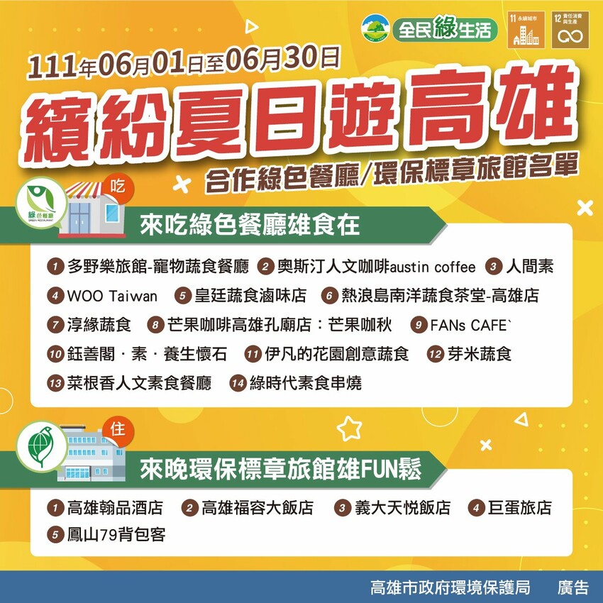 六月底前都能享有優惠折扣,出發前,也先上全民綠生活資訊平台,查詢高雄綠色餐廳、環保旅店