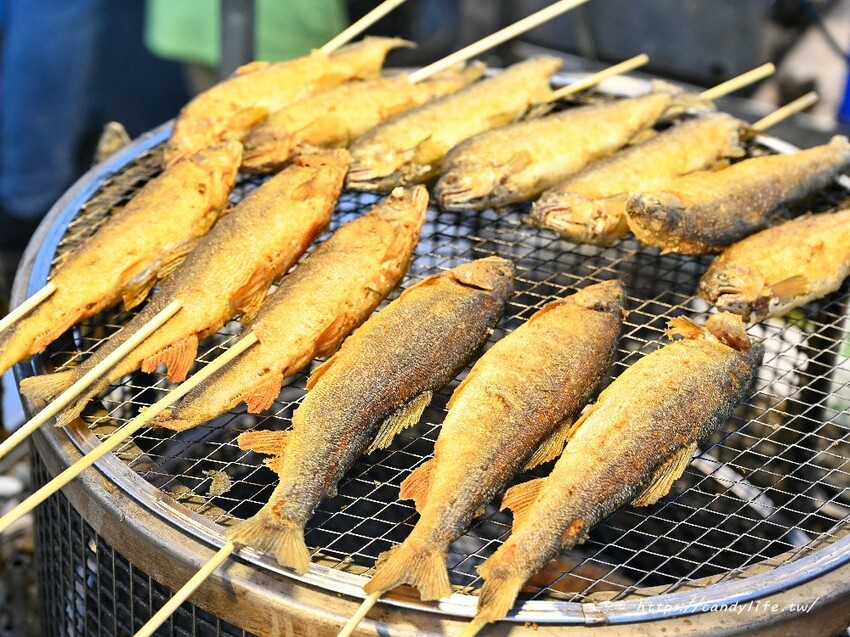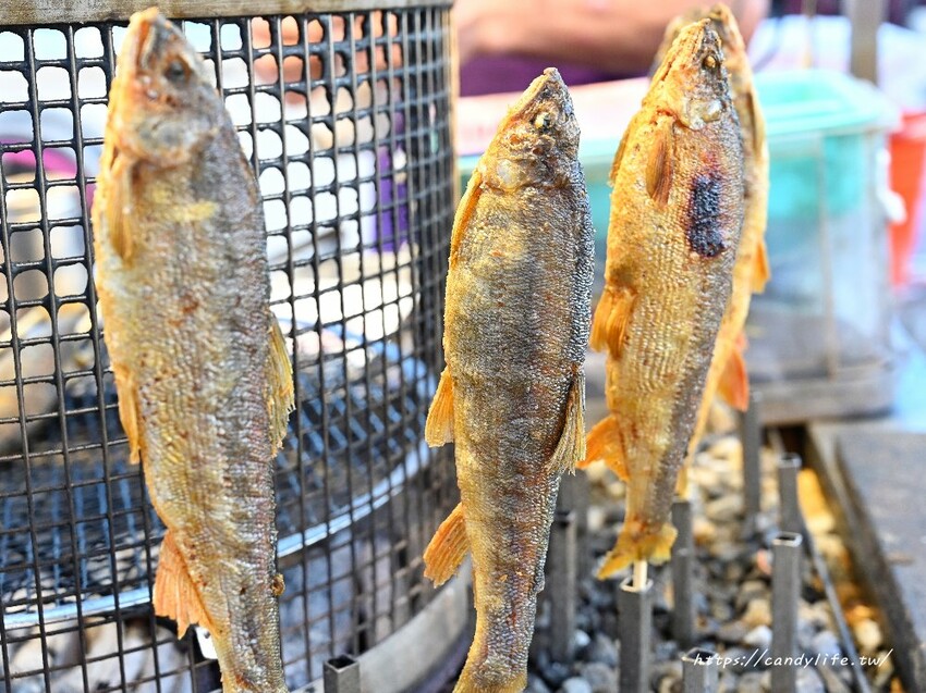 糖糖買的是母香魚,採用碳火下去現烤,不過糖糖看旁邊的炸爐旁也有放香魚,應該是先炸後烤,老闆說整隻香魚都是可以吃的,裡頭的刺已經烤得很酥很酥,吃的時候不必再挑刺