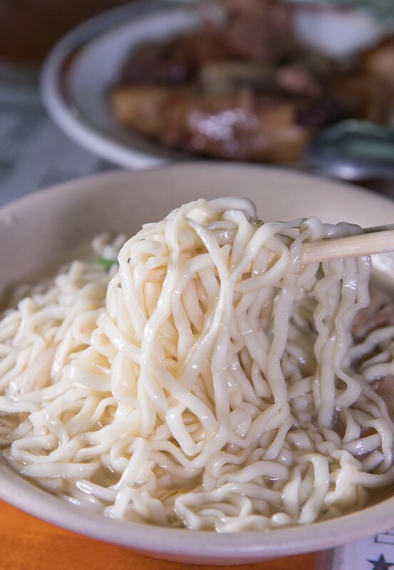 先說這查了一下頗繁鎖的湯頭,豬後腿肉剁碎放進鍋裡炸,加上扁魚、蔥、醬油熬煮二小時,再放入蛤、大骨等湯料提味,雖然用了這麼多食材,這麼費工但喝起來卻十分清爽,淡淡的油蔥、蛤子鮮和像是豬油渣的香氣相對明顯,再就是單純的麵香和放了三寶後的油甜。