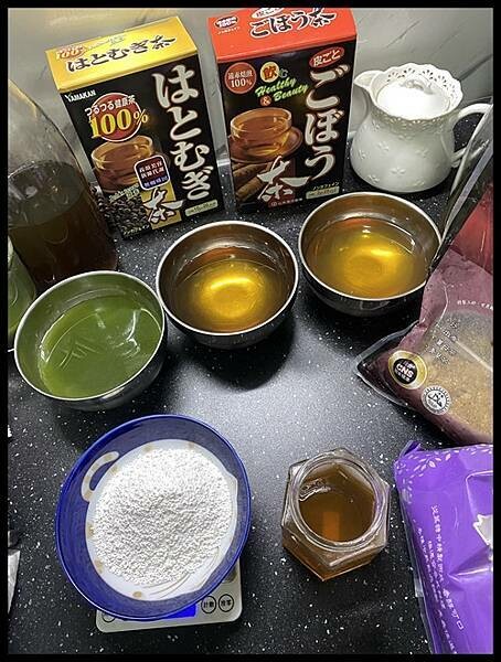 1. 將上述茶飲分別加入地瓜粉*50g與糖量*20g