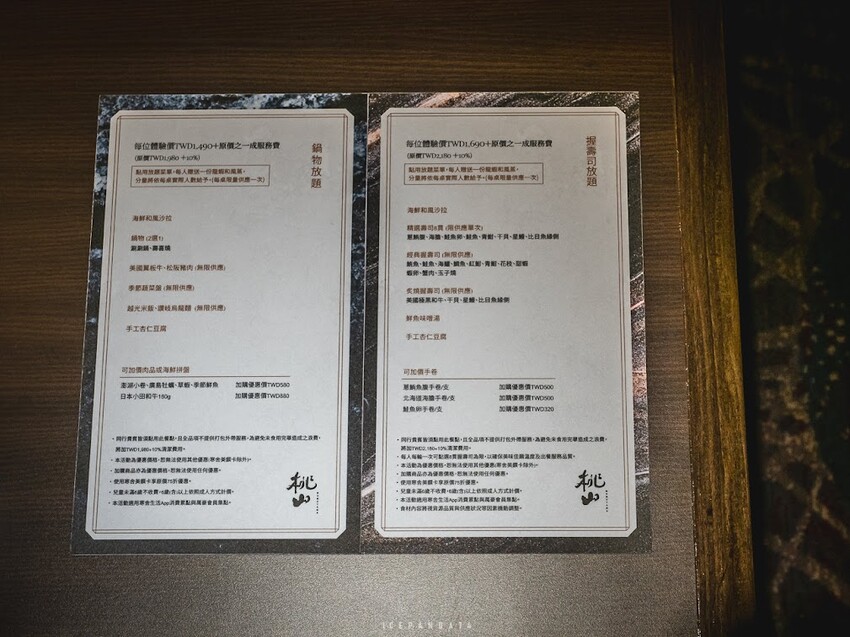 桃山推出的放題吃到飽有鍋物及壽司,鍋物放題的優惠價位為$1,490+原價$1,980的10%服務費,壽司放題的優惠價位為$1,690+原價$2,180的10%服務費,只要是點用放題,皆會贈送一份龍蝦和風蒸。壽司放題實在太過熱門、高朋滿座,在本月已全數額滿,於是在預約時,選擇了鍋物放題吃到飽。