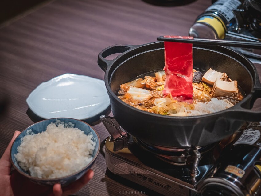 壽喜燒附有生蛋及味噌湯,可以在涮肉完成後,沾取蛋液一起吃;一旁還有壽喜醬汁與柴魚高湯,鹹度自由調配。肉品方面一開始會端上翼板牛及松阪豬,若有不吃牛的人,可以告知服務人員。像粉絲的蒟蒻麵,吸飽了壽喜醬汁,吃起來堪稱一絕!甘鹹夠味,一點都不像印象中的蒟蒻麵,可見壽喜醬汁本身的優秀。