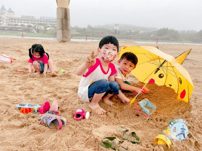 看完沙雕的我們待在橋下遮雨玩沙,睿睿跟好朋友玩得很開心呢!