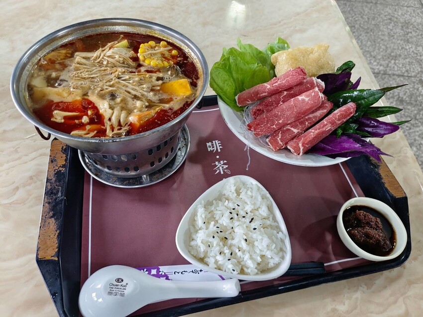 餐點部分有:雞腿飯/咖哩飯/排骨飯/日式豬排/麻辣火鍋/原味火鍋/厚片/無菜單料理最少需四人/