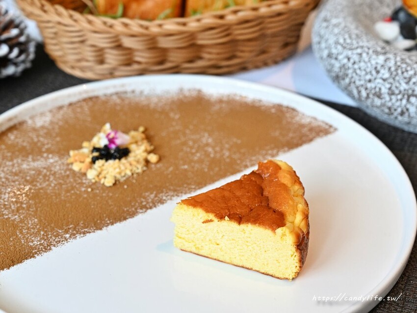 J先生的森林廚房的甜點依當天為主,糖糖這天吃到的私廚甜點是主廚自己特製的巴斯克乳酪蛋糕,口感綿密,帶著濃濃的乳酪香氣,旁邊採用了阿薩姆茶粉、手工餅乾碎及藍莓乾點綴,搭配享用別有一番風味唷