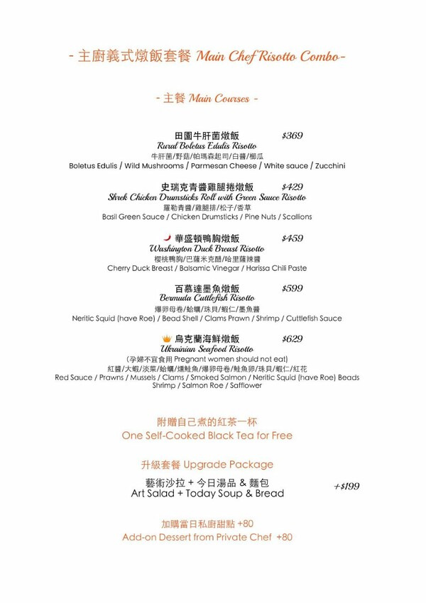 基底醬汁採用主廚特製的紅醬及紅花泡上白酒下去爆香,米粒燉煮的相當入味,除了紅醬的酸甜,還多了海鮮的鮮甜滋味,提醒大家因為這道裡頭有添加紅花,所以孕婦不建議食用唷~