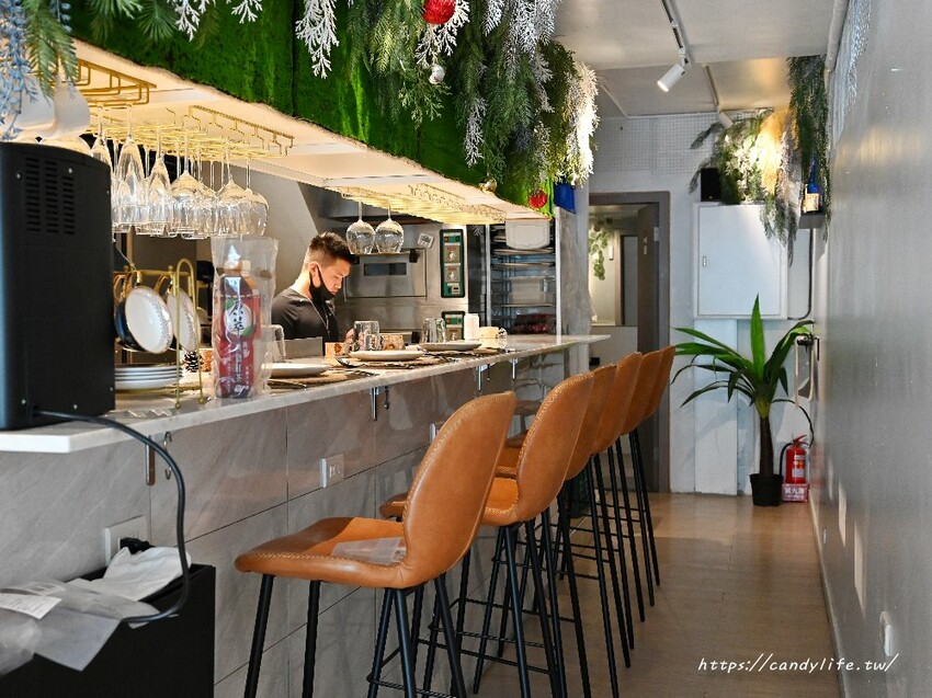 一樓的另一區是吧檯的座位,前方就是半開放式的廚房,坐這邊還可以欣賞主廚們的精湛廚藝