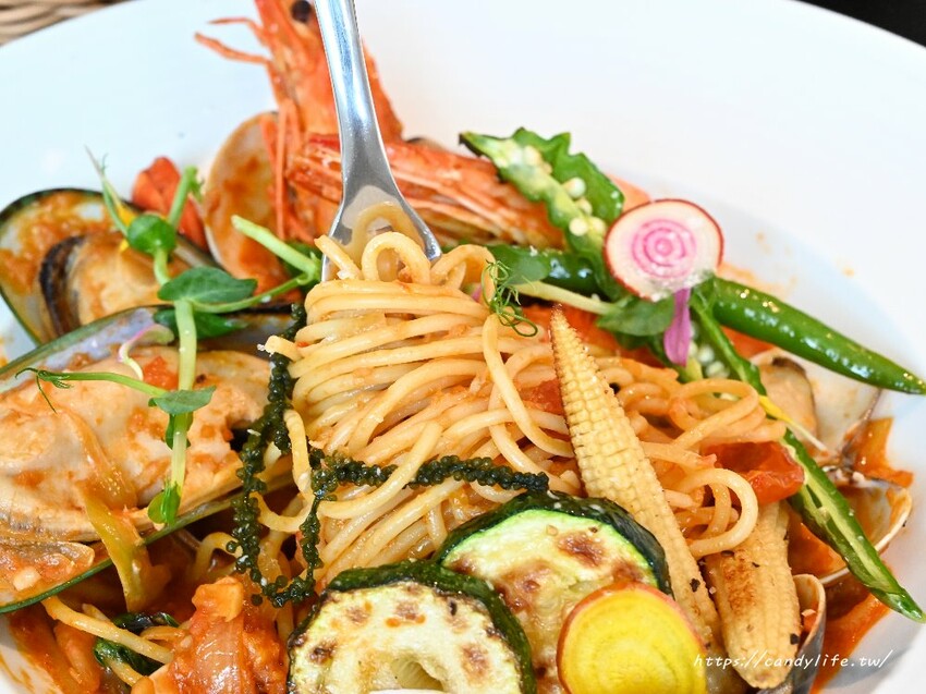 另一道義大利麵糖糖依舊點了海味十足的老酒辣醬海鮮麵,海鮮包含大草蝦、珠貝、淡菜、蛤蜊及蝦仁,裡頭一樣有搭配烤時蔬