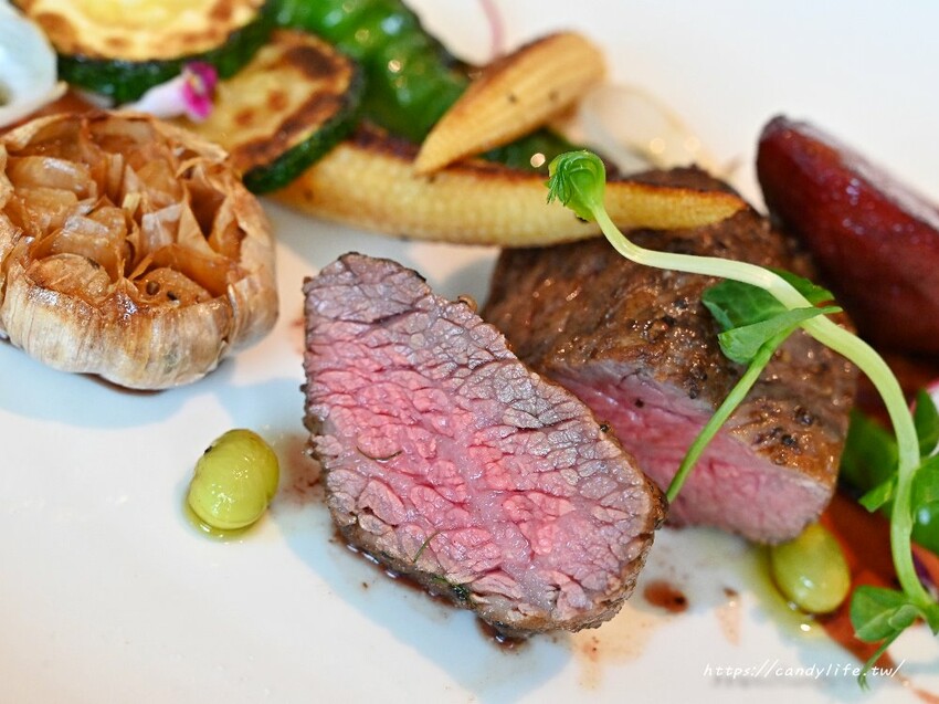 不只藝術沙拉、私房海鮮前菜,主餐擺盤也不妨多讓,一樣美到不行,理由除了烤時蔬,還有油封蒜頭、迷你洋蔥、紅酒燉洋梨佐上主廚特製的印度辣醬