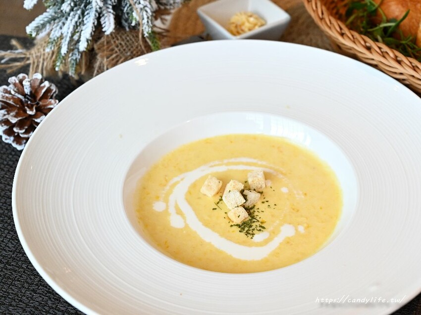 糖糖今天喝到的湯品是主廚特製的玉米濃湯,採用新鮮玉米下去炒過後加入鮮奶油及鮮奶下去熬煮,最後刨上橙皮增添香氣,讓香甜的玉米濃湯多了一股淡淡橙香,好喝~