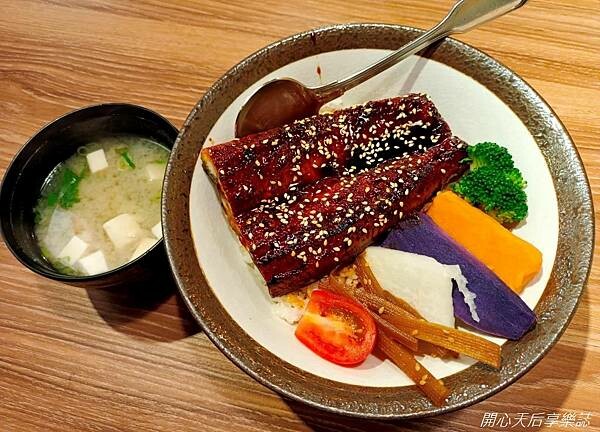 鰻魚飯320元,大片鰻魚醬色亮麗,搭配鮮艷的六色養生蔬果,更是誘人!