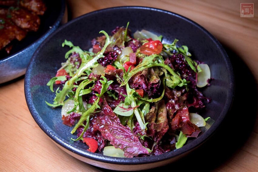 『想破頭的沙拉($220/份)』生菜搭配舒肥雞胸肉、吐司丁等,舒肥雞胸肉雖然切成小丁還是吃得出它的軟嫩,培根碎、芥末籽增加口感,撒上帕瑪森起司加上幾片紅酸模的點綴,最後當然主角就是凱薩醬汁。個人覺得是一道不敗的經典沙拉。